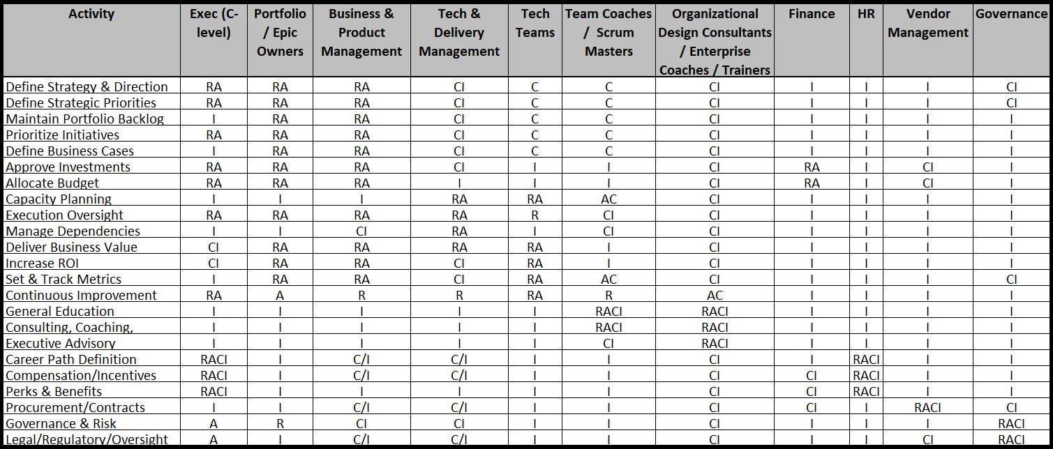 Frameworks like Scrum, Large-Scale Scrum (LeSS), and Lean Portfolio Management (LPM) embody this shift. Instead of decomposing work across many specialized roles, they bring accountability closer to the teams that deliver value. Roles are intentionally limited, but each carries a wider scope of responsibility. As a result, RACI—if it exists at all—becomes simpler and more fluid. It is not unusual to see combined designations such as RA, AC, or CI, reflecting shared ownership and collaboration rather than strict separation.
